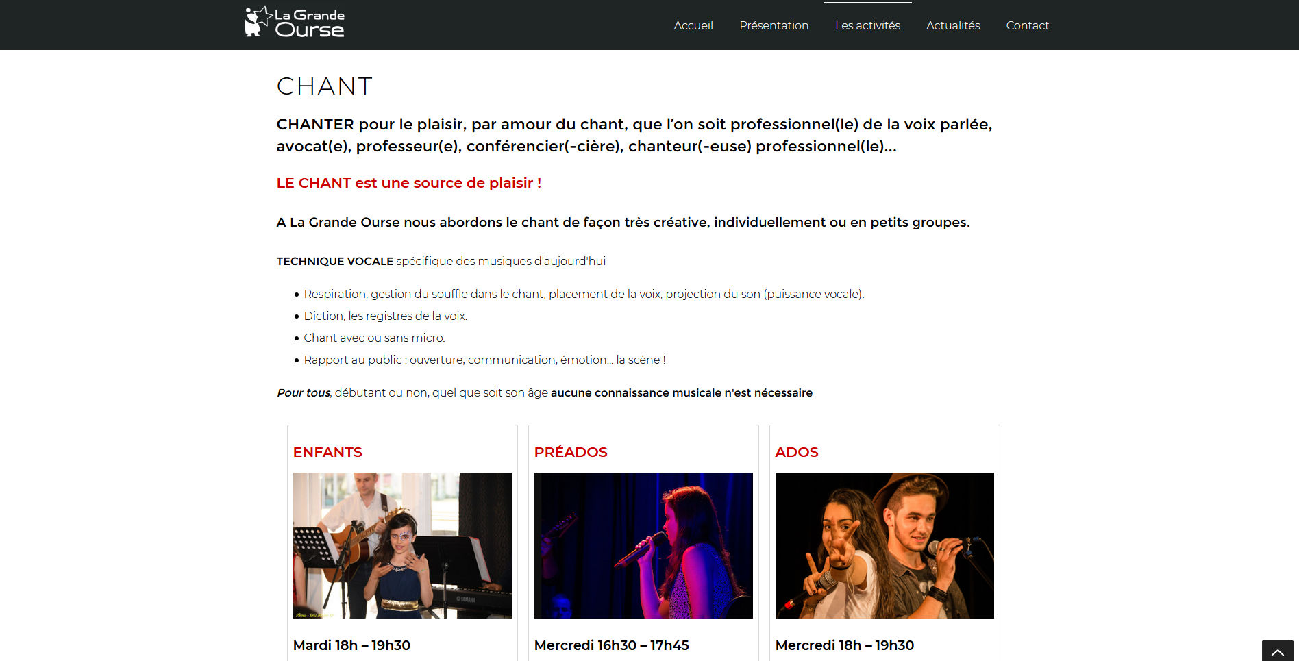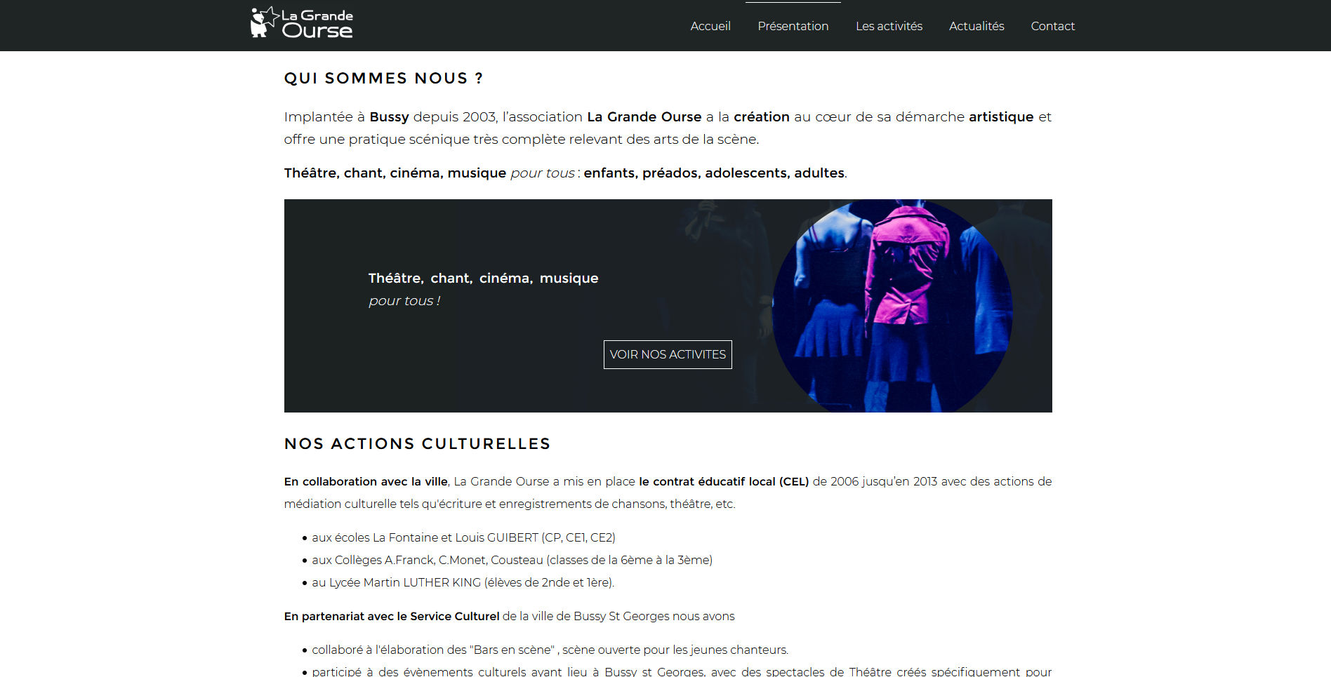 L'association culturelle La Grande Ourse propose des activités autour des arts de la scène pour tous publics, enfants, ados adultes, amateurs ou confirmés.